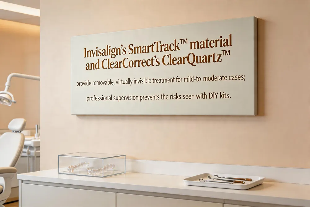 ClearCorrect and other brands – ClearCorrect® employs ClearQuartz™ material and a performance trimline for comfort and durability. Like Invisalign, it requires a series of custom trays and professional monitoring, making it suitable for adult cases involving crowding, gaps, or bite issues.