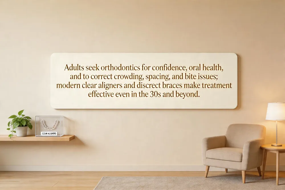 Is 34 or 35 too old for braces? No – adults in their thirties can still move teeth efficiently; modern clear aligners or discreet ceramic braces give excellent results, though treatment may be a bit longer than in teens.