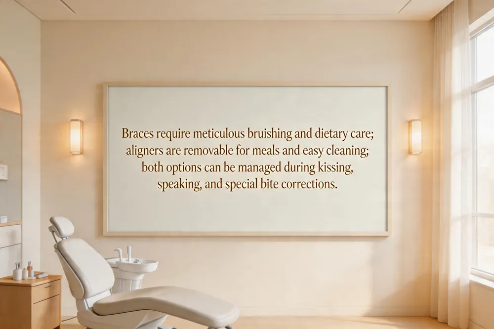 Keeping your mouth clean is essential whether you wear fixed braces or removable aligners. With braces, brush twice daily around brackets and use floss threaders or a water‑flosser; with aligners, remove them for meals, brush the teeth, and rinse the trays before putting them back. Speech may be briefly altered by lingual braces or bulky aligners, but most patients adapt within a few days; choosing a smooth, tooth‑colored bracket or a low‑profile aligner can reduce tongue irritation. Romantic moments are not a barrier—"Can I kiss my boyfriend with Invisalign?" Yes, the clear trays are smooth and virtually invisible; you can keep them in for a natural kiss or briefly remove them if you prefer. For bite issues, "What aligners are best for overbite?" Invisalign and ClearCorrect offer precise digital planning and attachments to close mild‑to‑moderate overbites, while severe cases may need a hybrid approach with auxiliary appliances. Finally, "Will braces be covered for TMJ?" Coverage is possible when the treatment is medically necessary to treat TMJ dysfunction, but it requires documentation and prior authorization; otherwise, flexible financing is available.