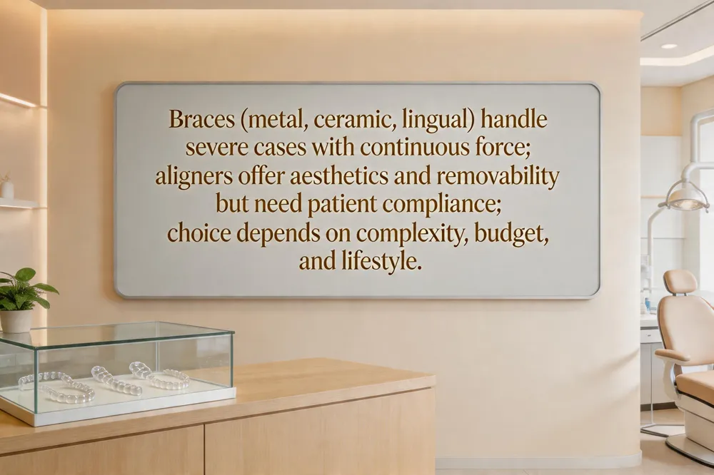 Teeth aligners vs braces – Aligners are removable and aesthetic; braces are fixed and visible.