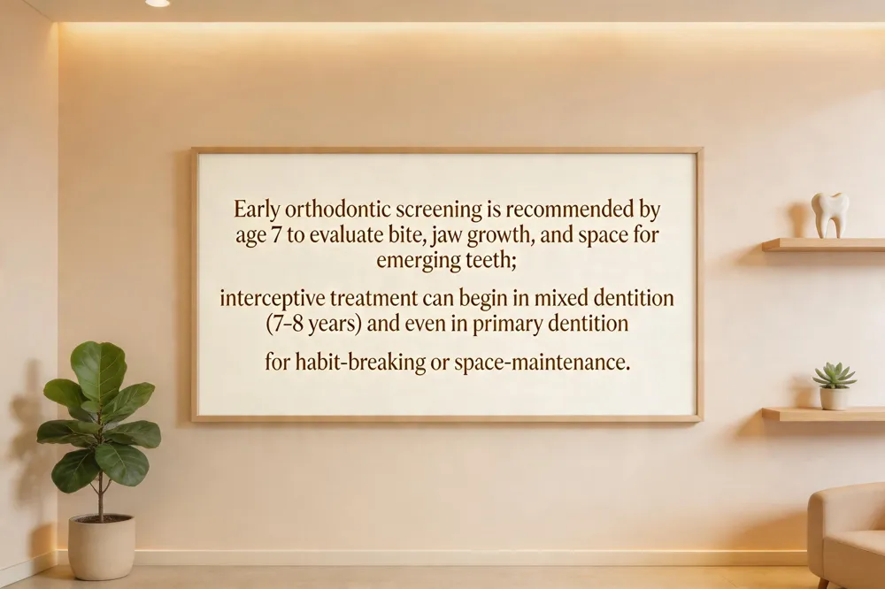 The American Association of Orthodontists (AAO) recommends that every child receive an orthodontic screening by age 7. At this point enough permanent molars and incisors have erupted to assess bite, jaw growth, and space for emerging teeth. Early evaluation catches problems—crossbites, crowding, thumb‑sucking, or missing teeth—before they worsen, often allowing a brief interceptive phase that uses palatal expanders or removable appliances.