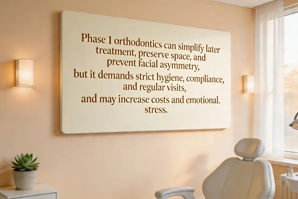 Early orthodontic (Phase 1) treatment can simplify or even eliminate the need for more extensive braces later by correcting problems while the jawbones are still soft and the teeth have short roots. It helps preserve space for permanent teeth, resolves crossbites and severe crowding, and can prevent facial asymmetry, injury, and the psychosocial effects of protruding teeth. The typical Phase 1 course lasts 10‑15 months, followed by a brief retention period before any later (Phase 2) work, often reducing the overall treatment time. However, it requires diligent oral‑hygiene supervision, consistent compliance with appliances, and regular office visits, which can be challenging for busy families and younger children.