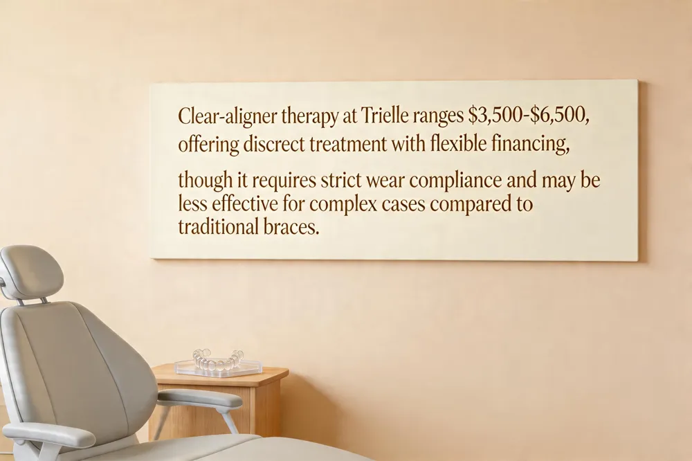 At Trielle Orthodontics, clear‑aligner therapy typically ranges from $3,500 to $6,500, depending on case complexity and the number of trays required. This aligns with the national average of $1,800‑$8,100. The practice accepts most dental‑insurance benefits and offers interest‑free financing plans to ease the financial burden.