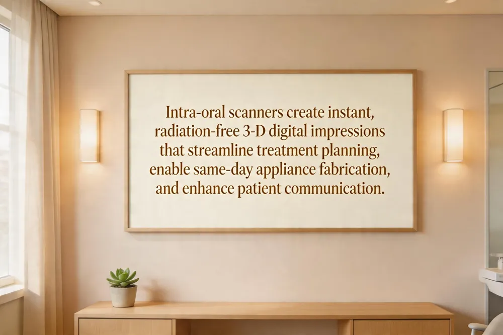 An intra‑oral scanner creates a precise digital impression of the teeth and gums in seconds, eliminating messy putty trays and uncomfortable traditional molds. The high‑resolution 3‑D scan is instantly available for treatment planning, allowing orthodontists to design clear aligners, braces, and other appliances with pinpoint accuracy. Because the data is digital, it can be sent directly to the lab or a 3‑D printer, dramatically reducing turnaround time and the chance of remakes.