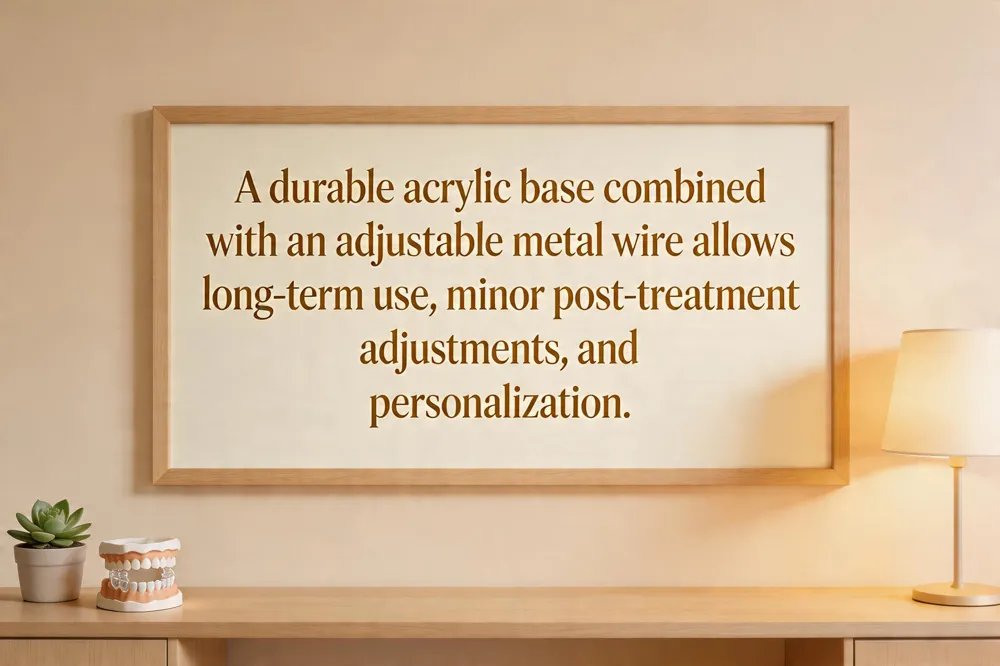Hawley retainers are made of a hard acrylic base that rests against the palate (or tongue side) plus a thin stainless‑steel wire that holds the front teeth. The acrylic gives the device a long service life—often 2–10 years with proper care—while the wire can be bent or reshaped by the orthodontist for minor post‑treatment tooth movements.