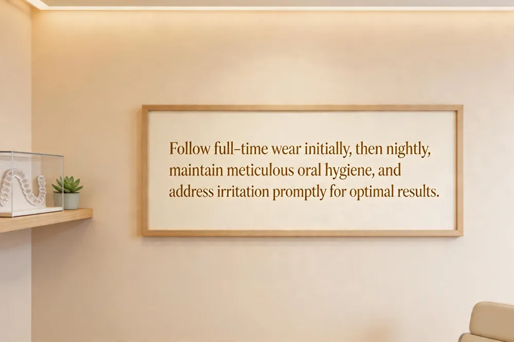Trielle Orthodontics advises that a clear retainer be worn full‑time—about 20‑22 hours daily—during the first 3‑6 months after treatment, removing it only for eating, brushing, and flossing. After this initial phase, nighttime wear only is usually sufficient. During the early months you should not go longer than two hours without the retainer; a brief lapse can allow the teeth to shift, especially within the critical six‑month window. If you have gingivitis, you may continue to wear the retainer, but meticulous oral hygiene is essential: brush and floss twice a day, use an alcohol‑free antimicrobial mouthwash, and rinse the retainer with a soft brush after each removal. Should the appliance feel tight or cause gum irritation, take a short break and soak it in a mild cleaning solution before reinserting it, and schedule a check‑up. Clear retainers are fabricated from medical‑grade, BPA‑free thermoplastic polymers such as polyurethane or PETG, which are lightweight, durable, translucent, and biocompatible. These materials provide a discreet, comfortable fit while resisting staining and warping when cared for properly.