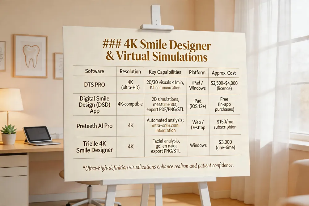 | Trielle 4K Smile Designer | 4K | Facial analysis, golden‑ratio proportions, PNG & STL export | Windows | $3,000 (one‑time) |
