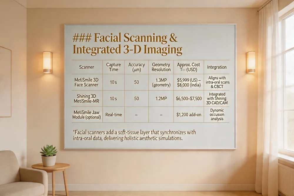 | MetiSmile 3D Face Scanner | 10 s | 50 | 1.3 MP (geometry) | 5 MP (texture) | $5,999 (US) – $8,000 (India) | Aligns with intra‑oral scans & CBCT for comprehensive patient model |