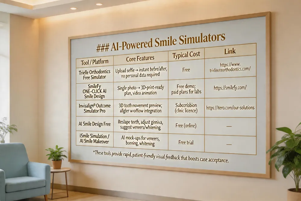 | SmileFy ONE‑CLICK AI Smile Design | Single photo → 3‑D‑print‑ready plan, video animation, chairside mock‑up | Free demo; paid plans for labs | https://smilefy.com/ |