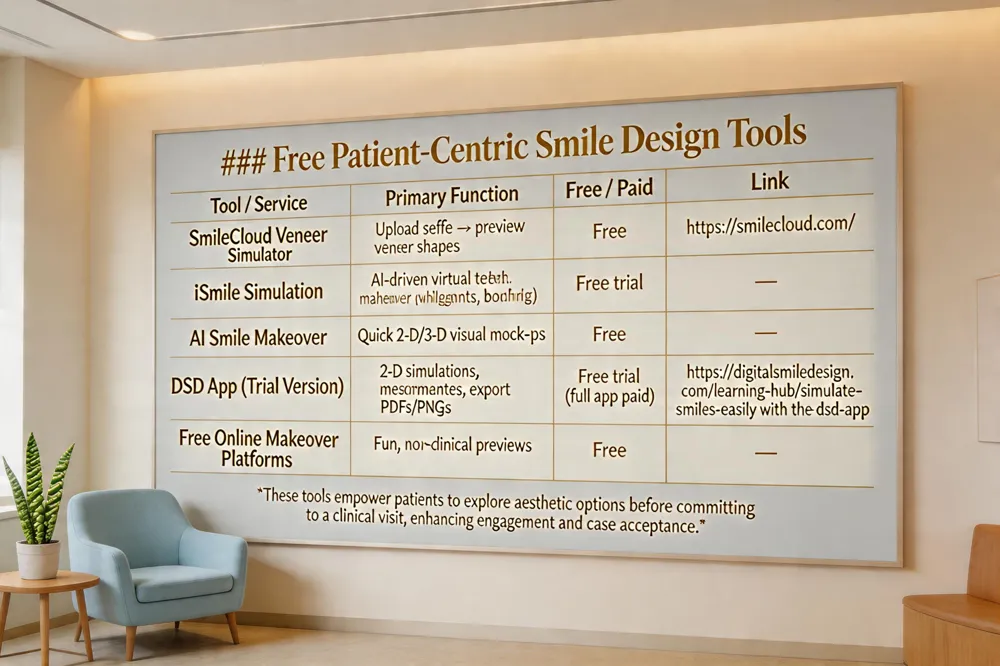 | SmileCloud Veneer Simulator | Upload selfie → preview veneer shapes, thickness, shades | Free | https://smilecloud.com/ |