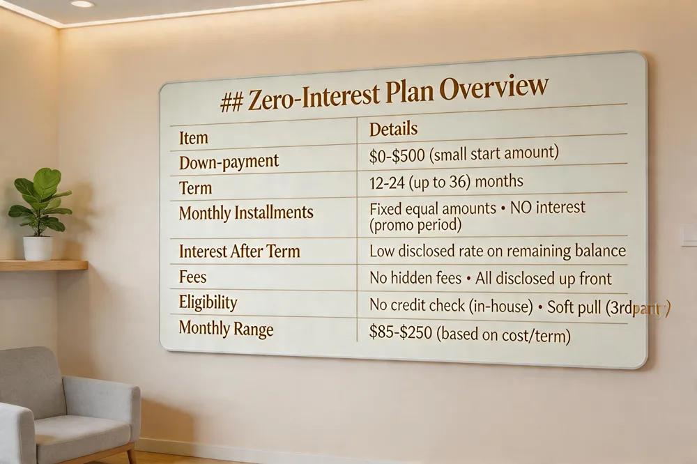| 3. Choose financing | In‑house zero‑interest or third‑party lender (CareCredit, Cherry, Sunbit) |