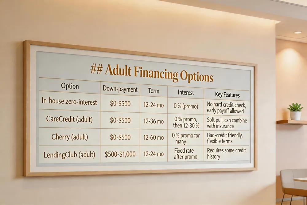 How does orthodontic financing work for adults? After a down payment, adults choose a 12‑ to 24‑month interest‑free schedule, or a longer third‑party plan with promotional rates, applying insurance, HSAs/FSAs, and discounts first.