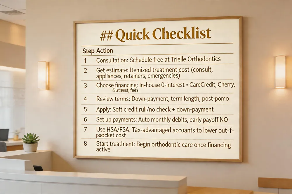 Zero‑interest orthodontic payment plans let families spread the full cost of braces or clear aligners over 12‑24 months (or up to 36 months in some offices) without paying any interest. At practices such as Trielle Orthodontics, a modest down payment is required and the remaining balance is split into equal monthly installments that stay the same for the life of the plan. To start the financing process, schedule a complimentary consultation, ask the staff for a detailed, itemized treatment estimate, and discuss the available in‑house or third‑party options (e.g., CareCredit, Cherry, Sunbit). The office will walk you through the application—often a soft credit pull or no credit check—collect a down payment, and set up automatic monthly debits. For further information, review the AAO’s Gifted Smiles Program, check your HSA/FSA balance, and visit Trielle’s website or call the office for FAQs on zero‑interest financing.