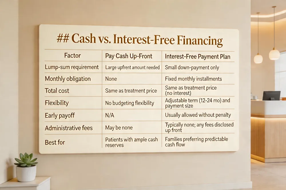 Impact on overall cost Both cash and interest‑free plans keep the treatment price identical; the difference lies in cash flow. For those with available cash, paying up front avoids any administrative fees. For most families, a flexible, interest‑free plan spreads the expense without increasing the overall amount.