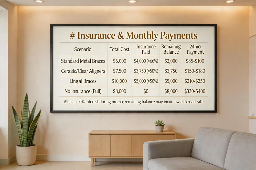 Monthly payment for braces with insurance – For a $6,000 treatment where insurance pays $4,000, the $2,000 balance can be spread over 24 months, resulting in payments of roughly $85‑$100 per month. Our 0 %‑interest plans start at $89 per month for 24 months for eligible patients, and FSA/HSA funds can be applied to further reduce out‑of‑pocket costs.